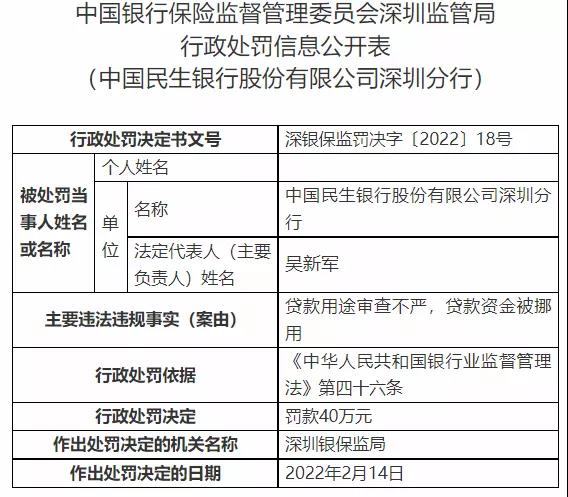 股份制银行也赫然在列。中国民生银行股份有限公司深圳分行和光大银行股份有限公司深圳分行都因为贷款用途审查不严,贷款资金被挪用而被处罚40万元。