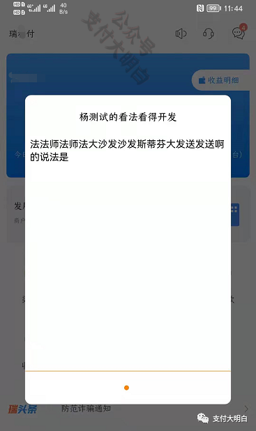 在瑞和付的APP弹框提示页面显示:法师法师….