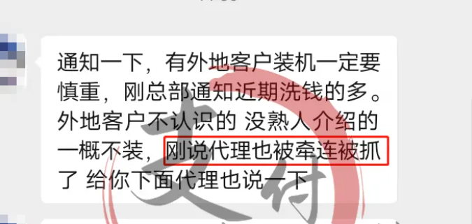近日,有代理商曝料称,给不熟的客户办机器一定要慎重,近期洗Q的犯罪分子多,不是面对面办理或者熟人介绍的用户一概不装,刚才有代理商受到牵连被抓了。