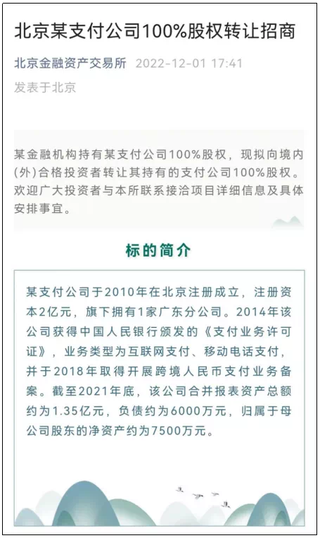 近日,北京金融资产交易所公布一则支付公司100%股权转让的招商信息,某金融机构拟向境内(外)合格投资者转让其持有的支付公司100%股权。 标的信息显示,该支付公司于2010年在北京注册成立,注册资本2亿元,旗下拥有1家广东分公司。2014年获得中国人民银行颁发的《支付业务许可证》,业务类型为互联网支付、移动电话支付,并于2018年取得开展跨境人民币支付业务备案。截至2021年底,该公司合并报表资产…- 95