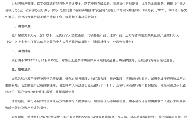 为加强账户管理,保障持卡人资金安全,银行“清卡行动”仍在持续进行中。 平安银行公告平安银行1月4日的公告表示将对长期不使用的个人银行账户纳入“睡眠户”的管理,“睡眠户”将被限制非柜面金融服务。清理范围为截至2021年12月31日,连续3年以上(含3年)未发生存现、取现、转账、消费等主动交易,且累计账户余额为等值人民币10元(含)以下的个人银行账户(包括I、II、III类银行结算账户及个人外币账户)…- 92