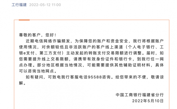 近日,工行福建分行发布关于调降部分客户线上渠道转账支付交易限额的公告称,近期电信网络诈骗频发,为保障您的账户和资金安全,我行将根据账户使用情况,对余额较低且非活跃账户的客户线上渠道(个人电子银行、工银e支付、第三方支付)主动发起的转账支付交易限额进行调整。 自4月以来,已有多家银行针对线上支付限额发布相关公告。 农业银行:近期电信网络诈骗频发,为保障客户账户和资金安全,落实监管规定,农业银行将陆续…- 44